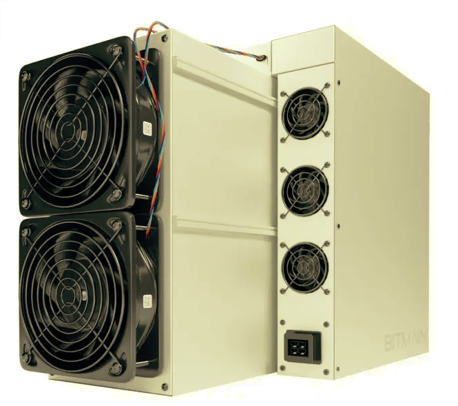 Model Antminer KS5 Pro from Bitmain mining KHeavyHash algorithm with a maximum hashrate of 21 Th/s for a power consumption of 3150W.